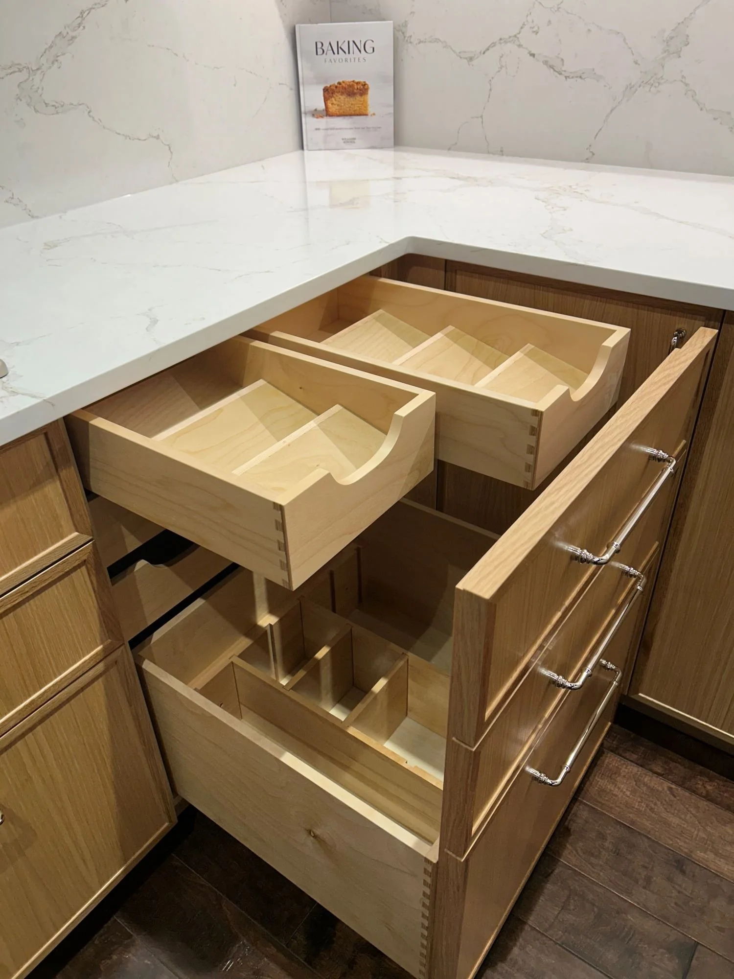 If you want your spices within arm’s reach, an upper cabinet pull-out is a game changer. Systems like the Rev-A-Shelf solid wood pull-out feature adjustable shelves with sleek chrome rails. These pull-outs are built to customize your storage vertically—so you can tailor the height between shelves to suit everything from tiny spice jars to tall bottles. While you’re at it, consider a base cabinet pull-out for your oils, vinegars, and cooking sauces.